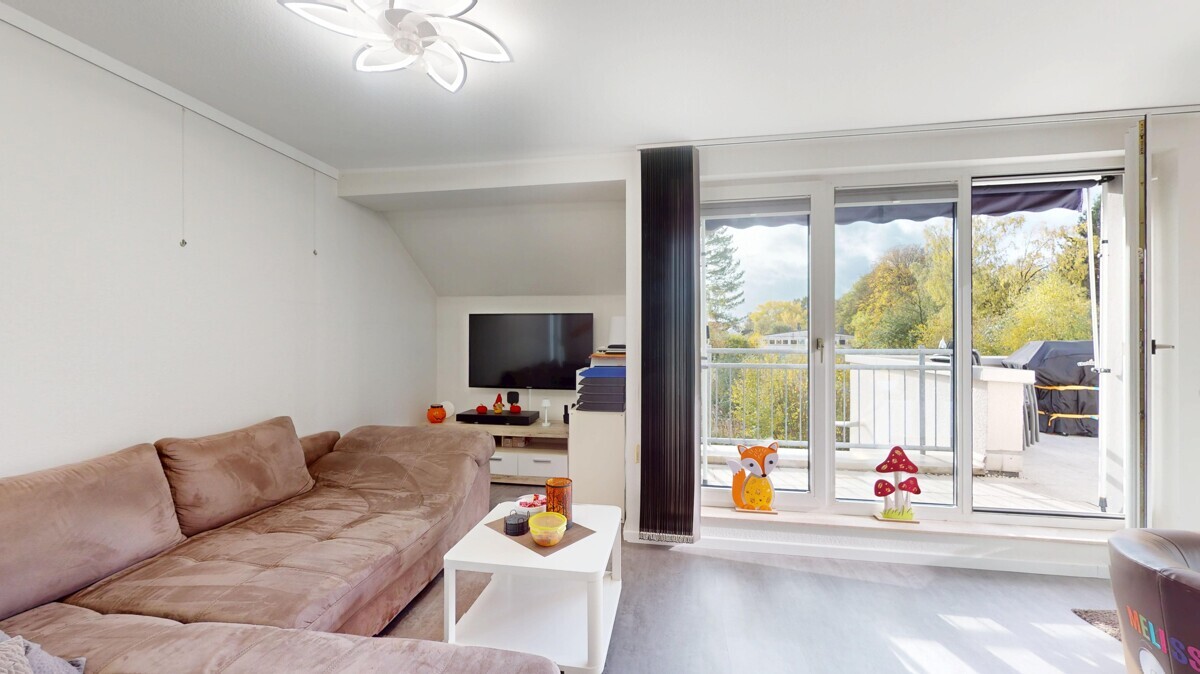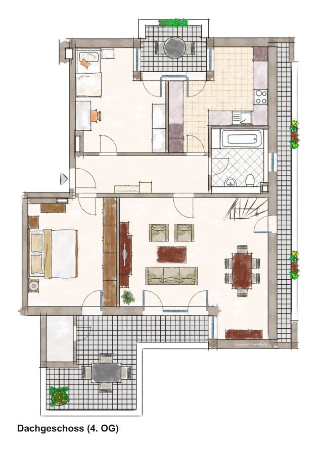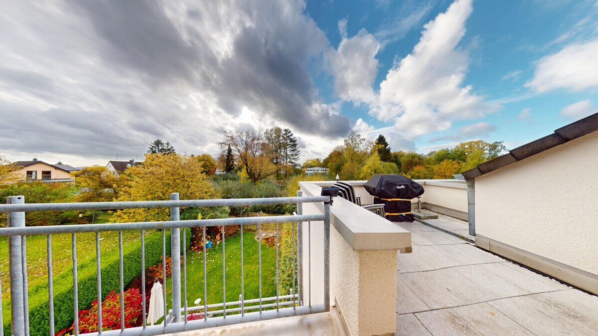 Der Wohn- und Essbereich ist offen gestaltet und bietet durch die großen Fensterflächen viel Tageslicht. Von hier aus gelangen Sie direkt auf die sonnige Dachterrasse, die einen herrlichen Blick ins Grüne bietet. Die Wohnung verfügt über eine separate Küche mit einer modernen Einbauküche und Zugang zu einem kleinen Balkon.