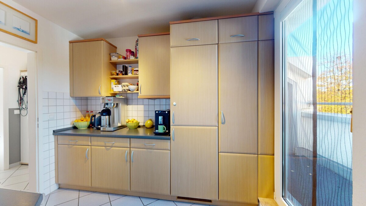 Der Wohn- und Essbereich ist offen gestaltet und bietet durch die großen Fensterflächen viel Tageslicht. Von hier aus gelangen Sie direkt auf die sonnige Dachterrasse, die einen herrlichen Blick ins Grüne bietet. Die Wohnung verfügt über eine separate Küche mit einer modernen Einbauküche und Zugang zu einem kleinen Balkon.