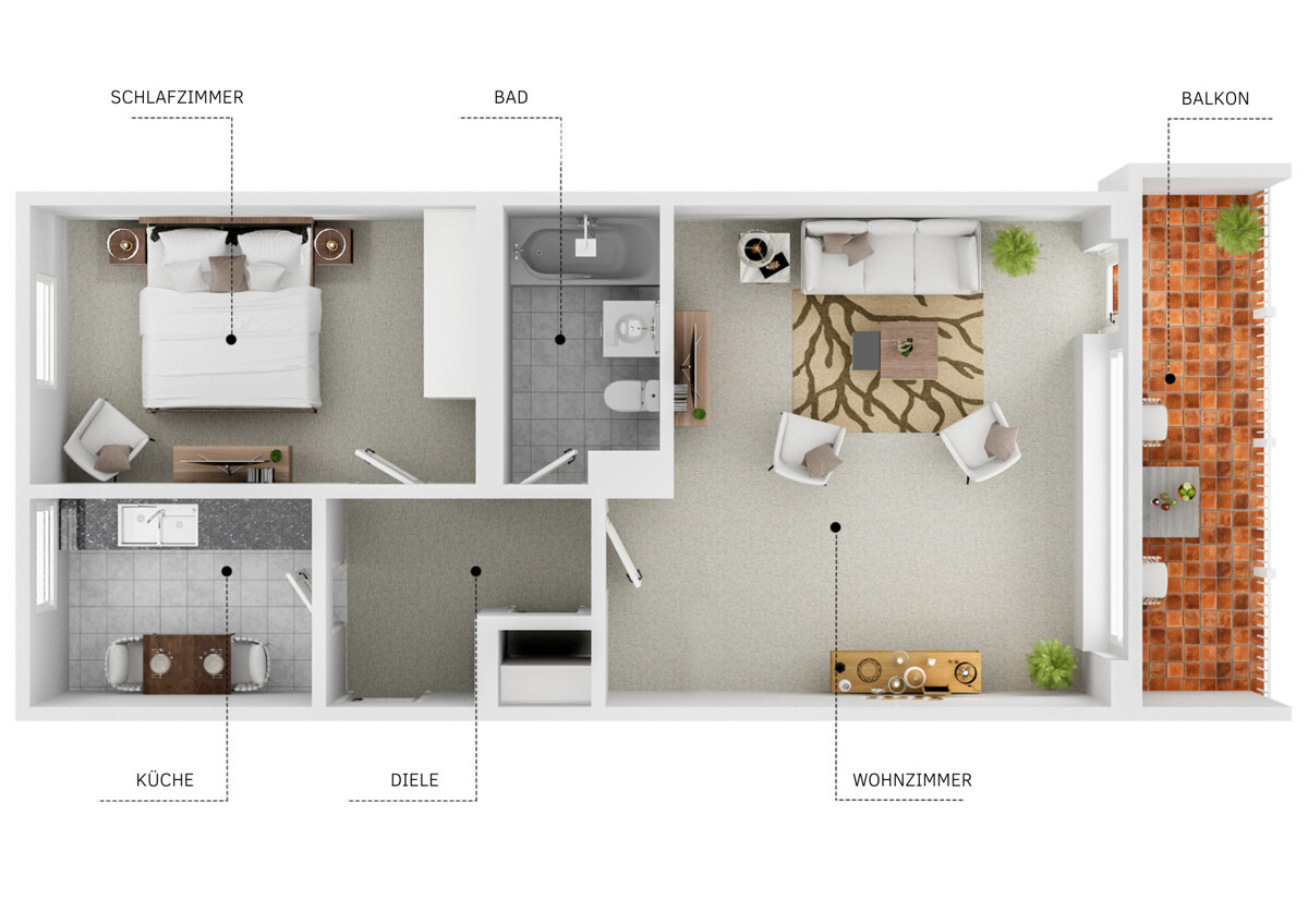 Sie gelangen über einige Treppenstufen zum Eingang der Wohnung. Von der Diele mit Abstellbereich / Garderobe gelangen Sie links zur separaten Küche und dem geräumigen Schlafzimmer, geradeaus in das innenliegende Bad und rechts zum geräumigen Wohnraum mit Zugang zum überdachten Balkon. Die modernen Fenster verfügen über Schlösser. Die Wohnzimmerfenster verfügen über Rollläden.