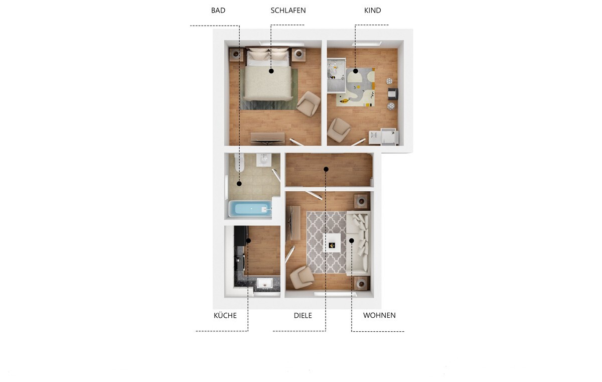 Die Wohnung verfügt über zwei Schlafräume, einen Wohnraum mit Zugang zur Küche, eine Diele und ein Wannenbad mit Fenster.