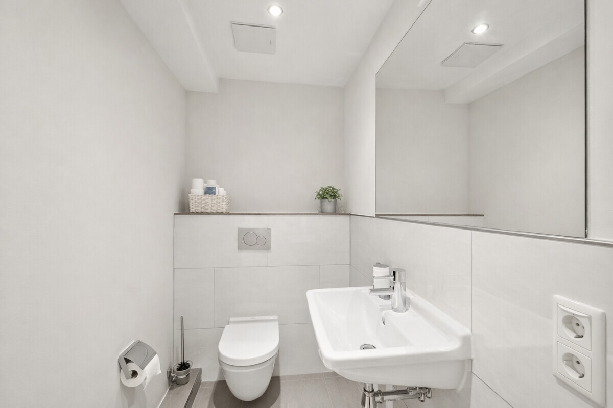Hier erwartet Sie eine wunderschön gestaltete Dachterrassenwohnung in einem denkmalgeschützten Gebäudeensemble des Düsseldorfer Architekten Hans Haas, welches ursprünglich als Kloster genutzt und 2013 vollständig saniert und zu einer attraktiven Wohnanlage im Grünen umgestaltet wurde. Diese charmante Wohnung liegt im ersten Obergeschoss. Eine einladende Diele mit ansprechendem Gäste-WC und Abstellbereich empfängt Sie. Geradeaus gelangen Sie in den gemütlichen Wohnraum mit offenem Küchenbereich. Eine kleine Diele führt ins Schlafzimmer mit Bad en Suite. Ebenfalls von dieser Diele aus erreichen Sie einen Abstellraum mit Waschmaschinenanschluss. Eine Wendeltreppe leitet Sie zur großen Dachterrasse von der Sie einen herrlichen Blick über die Wälder genießen. Die Wohnung ist mit einem schönen Vinylboden in Holzoptik, Fußbodenheizung und einer ansprechenden Einbauküche mit Kochinsel ausgestattet. Ein Stellplatz im Außenbereich der Klosteranlage gehört zur Wohnung. Die monatliche Miete für den Stellplatz beträgt 60 €. Ein Kellerraum vervollständigt das Angebot. Hinweis: Die dargestellten Aufnahmen wurden digital bearbeitet (Möblierung) und teilweise mithilfe KI-gestützter Verfahren optimiert. Abweichungen vom Ist-Zustand sind möglich. Haben wir Ihr Interesse geweckt? Dann freuen wir uns auf Ihre Kontaktaufnahme!