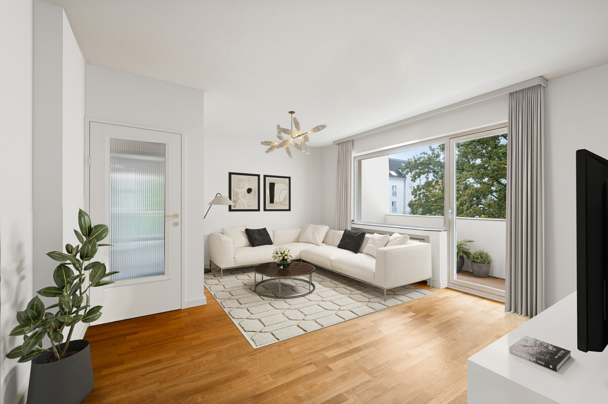 Die Wohnung (Wohnfläche ca. 90 m²) besteht aus einem Wohnzimmer, zwei größeren und einem kleineren Zimmer, einem Tageslichtbad mit Dusche (renoviert 2000), einem innenliegenden Bad mit Wanne (baujahrstypisch), einer separaten Küche, einer Diele und zwei Südwest-Balkonen zum Innenhof.