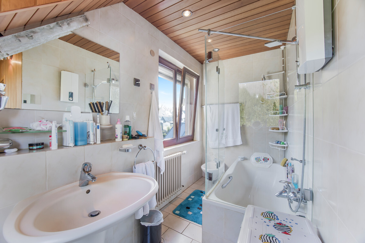 Im Obergeschoss finden Sie ein großes Schlafzimmer mit Zugang zur Ankleide, ein Kinder-/Arbeitszimmer sowie das Tageslichtbad mit Wanne, Dusche, WC und Bidet. Der Spitzboden ist ausgebaut und bietet viel Stauraum.