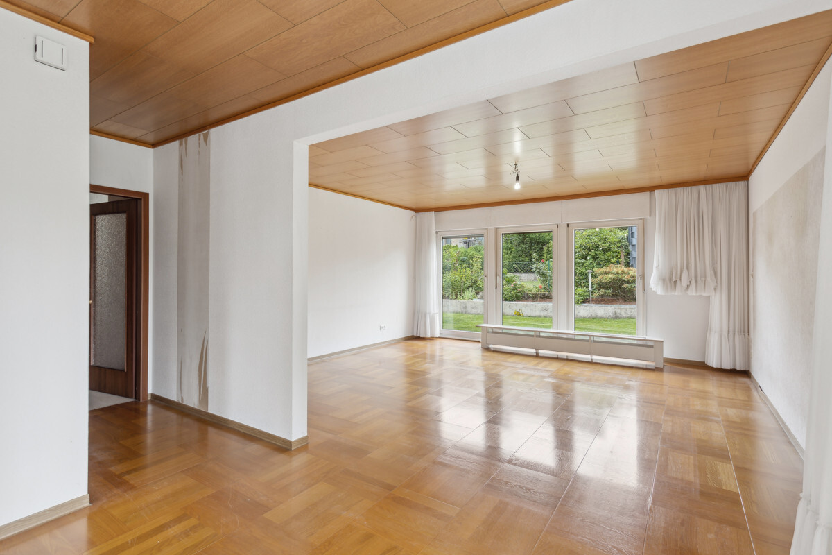 Im Erdgeschoss befindet sich eine geräumige (ca. 82 m²), unrenovierte 3-Zimmer-Wohnung mit Terrasse und Garten. Der Wohnraum ist mit Parkettboden ausgestattet. Der Garten bietet viel Platz und ist sehr gepflegt.