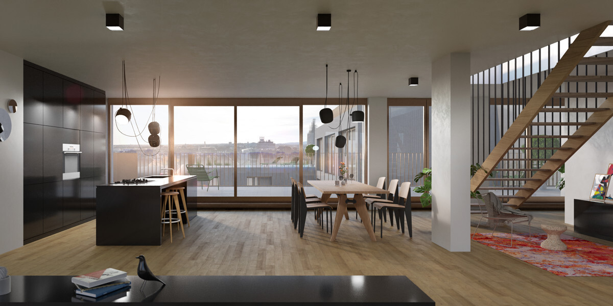 Die Wohnung verfügt über einen großen, hellen Wohnraum mit bodentiefen Fensterfronten zu beiden Seiten mit offener Küche und Zugang zur einladenden Dachterrasse. Über eine ansprechend gestaltete Treppe im Wohnraum mit darüber liegendem Dachfenster gelangen Sie zu einer zweiten Dachterrasse (ca. 43 m²), die zur Wohnung gehört.