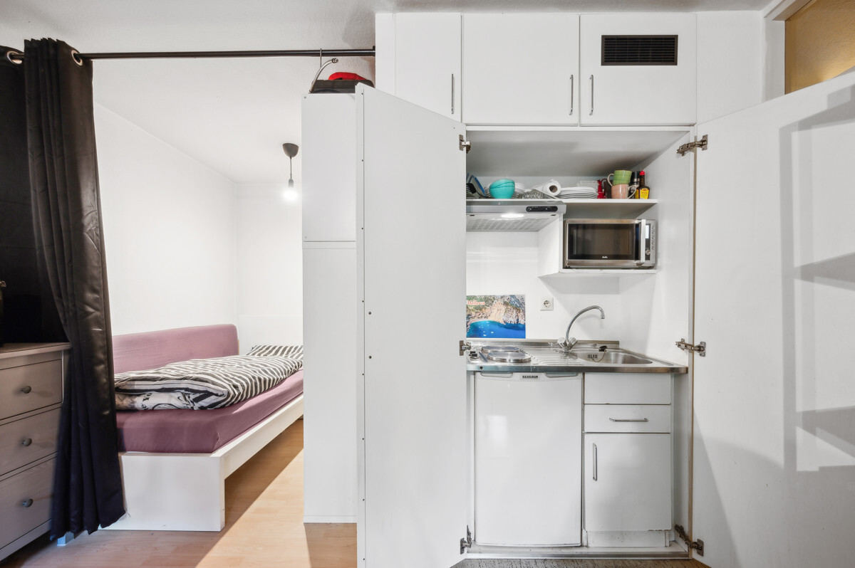 Das Gebäude wurde im Jahr 1994 in einer beliebten und ruhigen Seitenstraße errichtet. Die Wohnung hat ca. 38 m² Wohnfläche, welche sich auf ein Wohnzimmer mit Schlafnische, ein Duschbad, Diele und die Terrasse verteilt. Zusätzlich gibt es ein Kellerabteil zur Wohnung.
